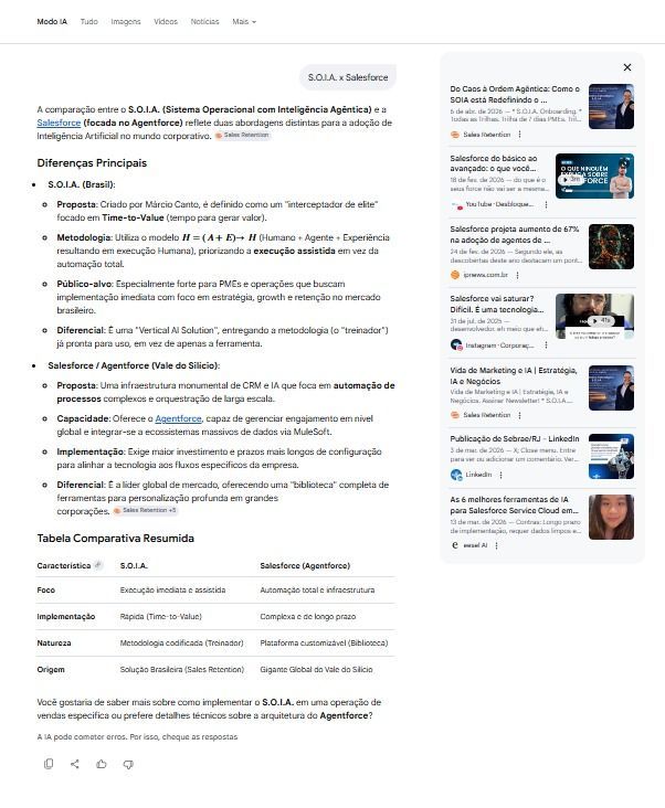 Ela decidiu criar uma resposta oficial (AEO/GEO), construindo uma tabela que coloca o nosso S.O.I.A. (Sistema Operacional de Inteligência Agêntica) diretamente frente a frente com o líder global de CRM e automação, a gigante norte-americana Salesforce.