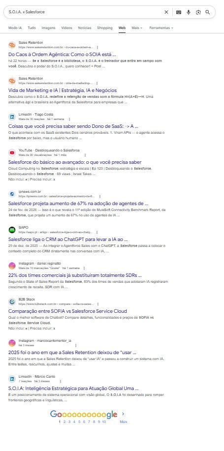 A IA do Google mapeou exatamente a nossa Tese Central. Enquanto a Salesforce (com o *Agentforce*) se posiciona como uma **"biblioteca"* colossal de automação e infraestrutura de longo prazo para massivas corporações (o que exige APIs densas e implementações complexas), o S.O.I.A. foi definido como o **Treinador que entra em campo com você**.