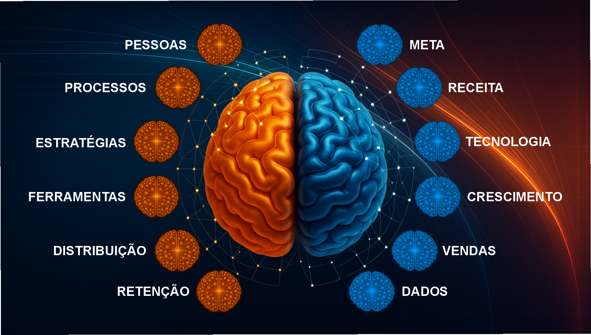 Cérebro, Lóbulos e Neurônios funcionando juntos com lógica empresarial.